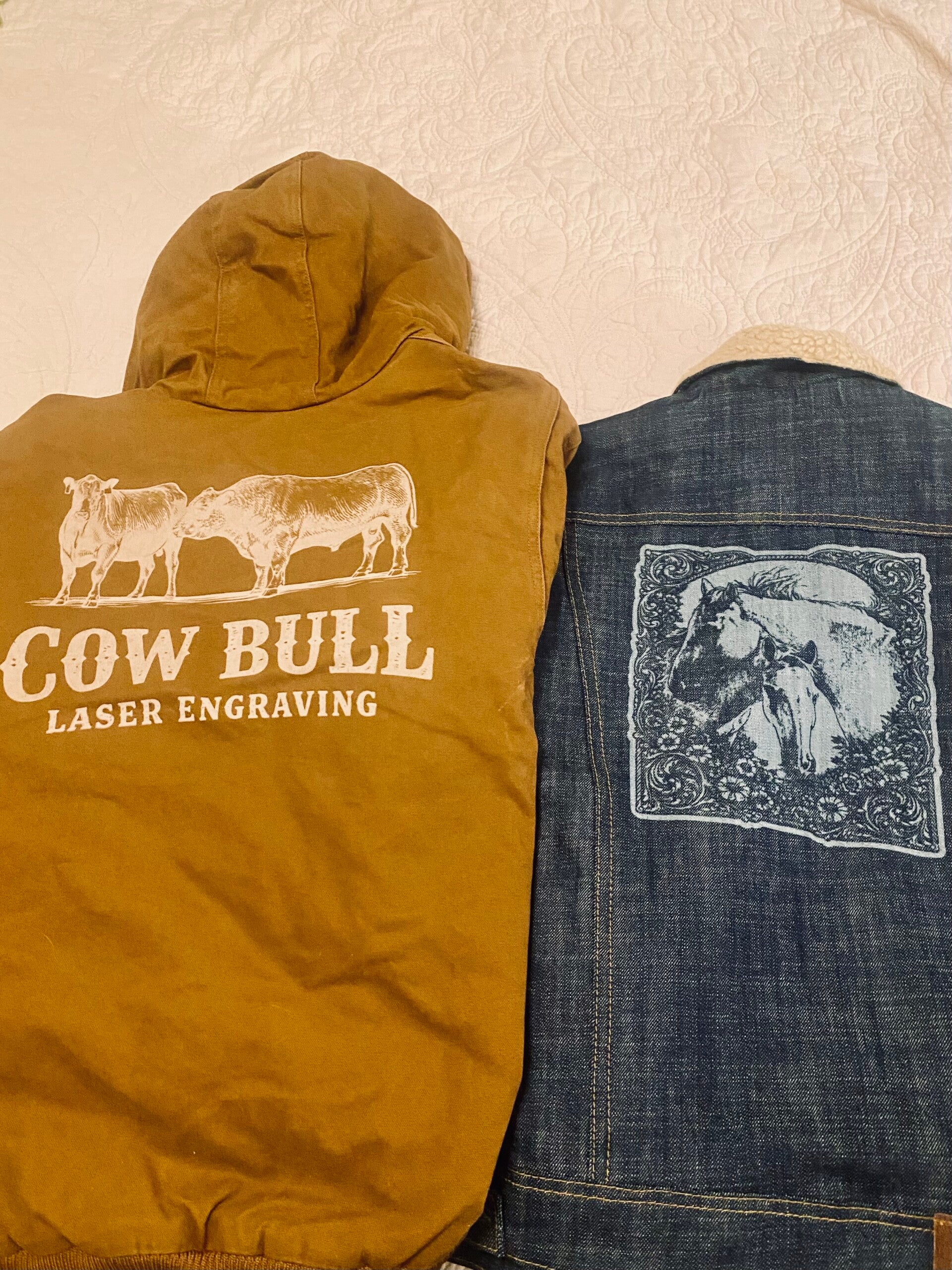 Welcome to Cow Bull Laser Engraving LLC, based out of a working ranch in western South Dakota. We understand what works and what doesn't in a real world environment. We specialize in Ritchey cow tags, denim and canvas jackets, and glass engraving.